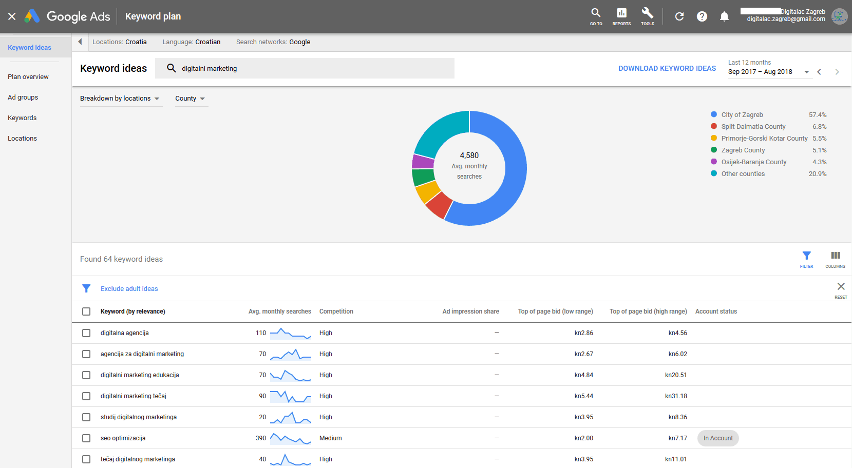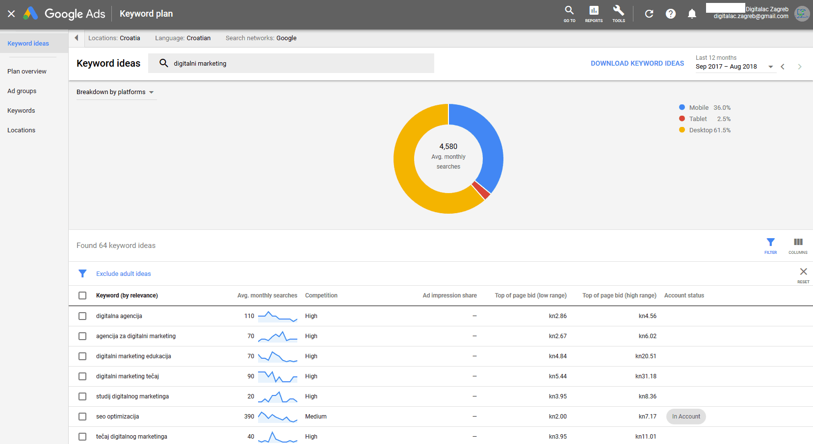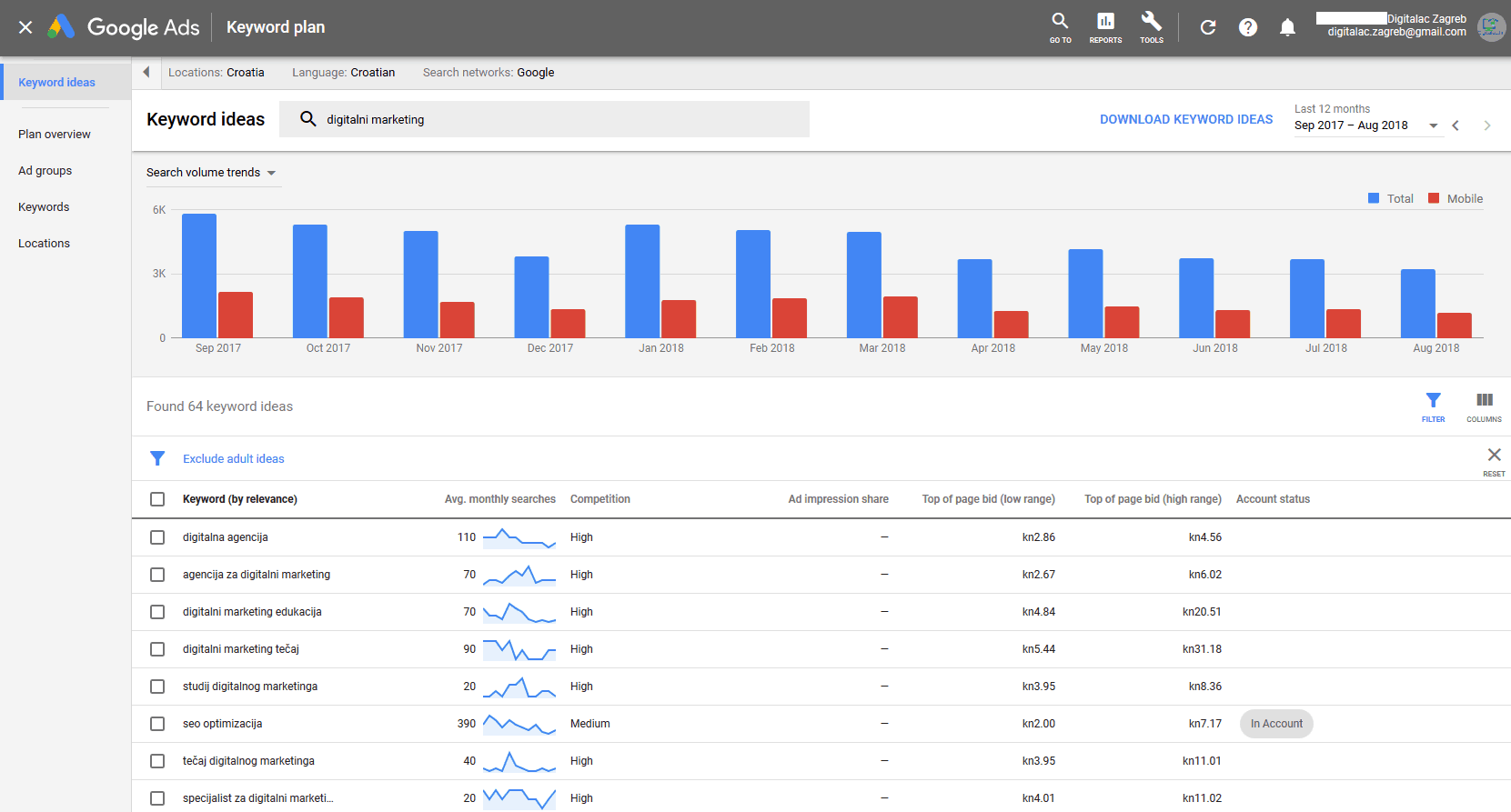 - Konkurencija : broj oglašavača koji su prikazani za svaku ključnu riječ u odnosu na sve ključne riječi na Googleu. Imajte na umu da su ti podaci specifični za targetiranje lokacije i pretraživačke mreže koju ste odabrali. U stupcu Konkurencija/Competition možete vidjeti je li konkurencija za ključnu riječ niska, srednja ili visoka.